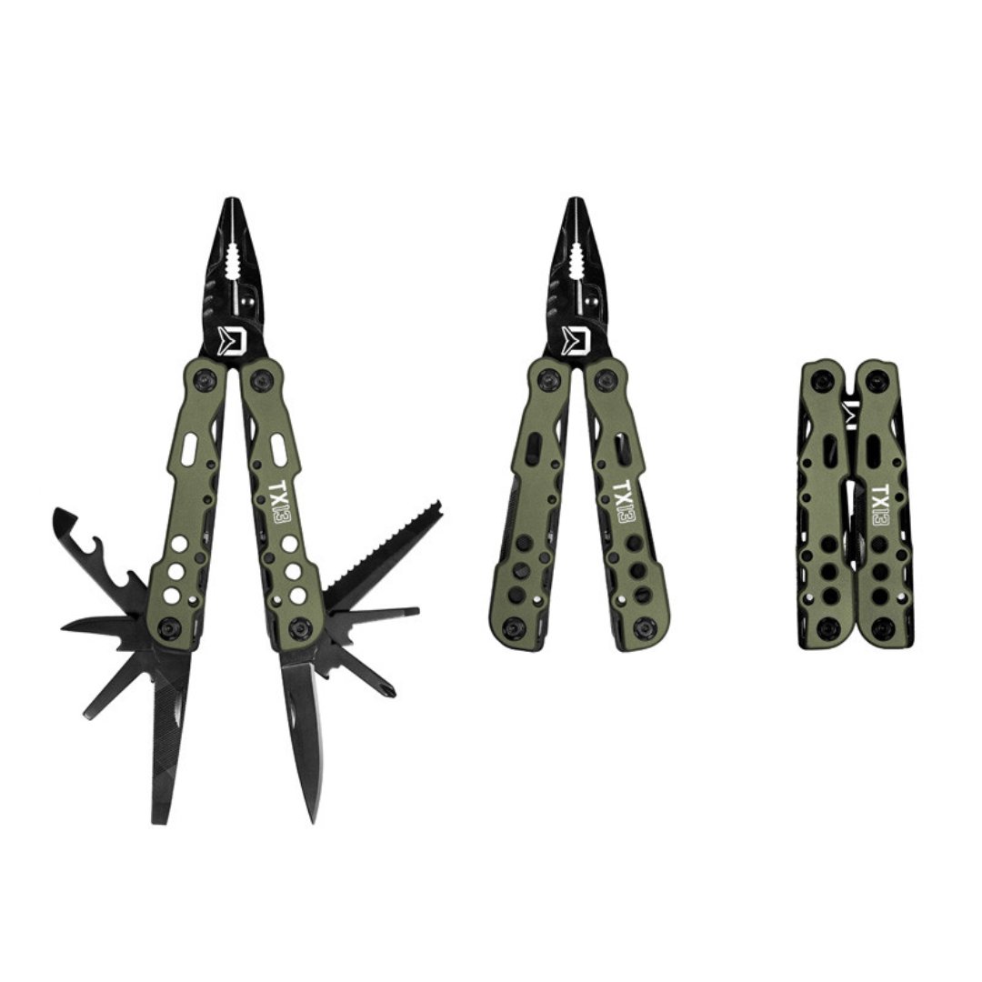 Le Delphin TaktyX 13 in acciaio inox Inox dispongono di 13 diversi strumenti: pinze combinate, coltello, sega, apribottiglie e apriscatole, lima, forbici a filo, perforatrice e quattro diversi cacciavite. Ognuno di questi strumenti ha un sistema di blocco di sicurezza.